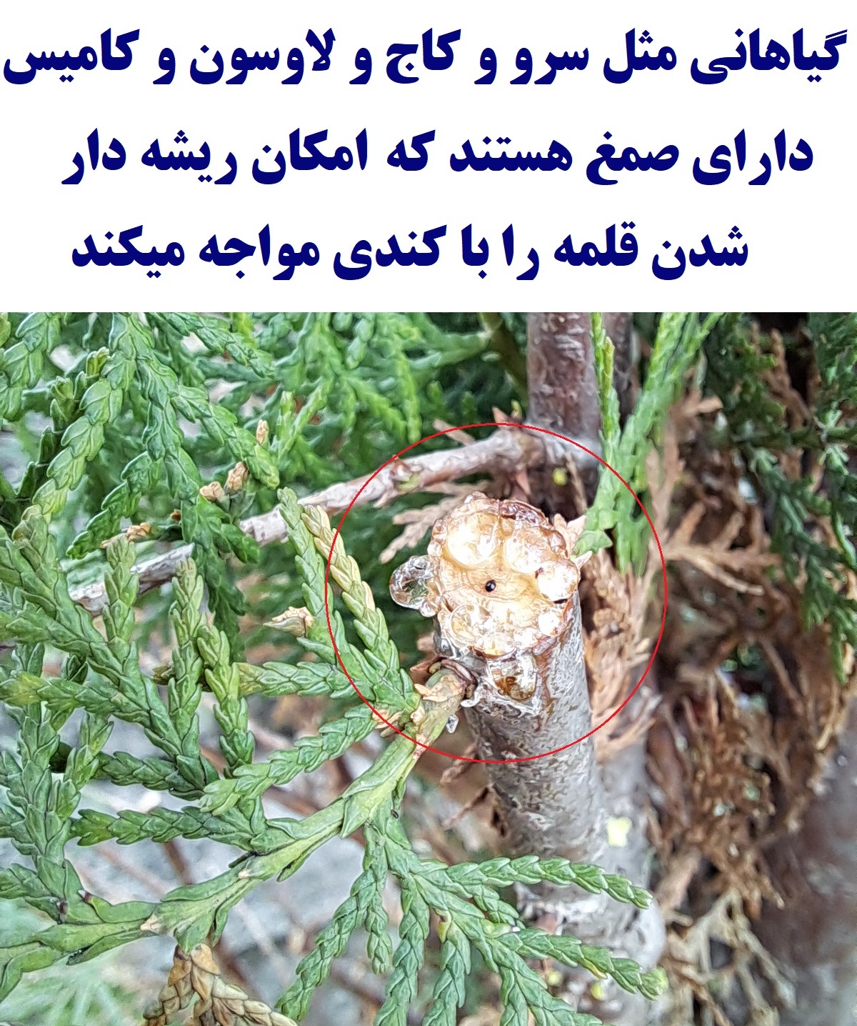 قلمه سرو یا کاج (مثل لاوسون) باید از رشد سال جاری و درختان جوان باشد. هرچه سن درخت مادری مسن تر باشد مقدار هورمونهای ذاتی گیاه کمتر و امکان ریشه زایی دیرتر خواهد بود. برای مثال قلمه از درخت 5 ساله لاوسون خیلی زودتر از یک درخت 10 ساله ریشه دار خواهد شد. مشکل دیگر در قلمه گیری از درختان مسن کاج و سرو این است که این قلمه ها بعد از ریشه دار شدن ممکن است بجای رشد رویشی رشد زایشی داشته باشند. به این معنی که جوانه های جدید بجای تولید برگ و ساقه مخروطهای حاوی گرده تولید کنند. در این حالت رشد جوانه انتهایی به تولید گرده اختصاص میابد و رشد نخواهد کرد برای رشد باید این جوانه ها هرس شده و حذف شوند. عده ای این حالت را با بیماری قارچی اشتباه میگیرند چون گرده های موجود در مخروط موقع پخش شدن در اثر تکان شبیه هاگهای قارچ پراکنده میشوند. شکل زیر